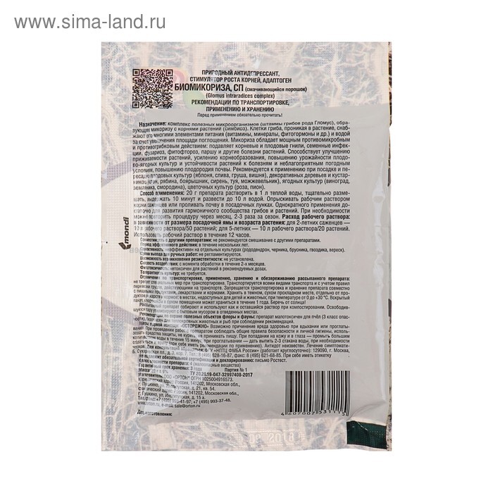 Комплекс полезных микроорганизмов (штаммы грибов рода Гломус), образующих микоризу с корнями растений (симбиоз). Клетки гриба, проникая в растение, снабжают его многими элементами питания (витамины, минералы, фитогормоны и др.) и водой за счет увеличения площади поглощения. Микориза обладает мощным противомикробным и противогрибковым действием: подавляет корневые и плодовые гнили, семенные инфекции, микроспориоз, фузариоз, фитофтороз, паршу и другие болезни растений. Способствует улучшению приживаемости растений, усилению корнеобразования, увеличению урожайности плодово-ягодных культур, повышению устойчивости растений к болезням и неблагоприятным погодным условиям, повышению плодородия почвы.