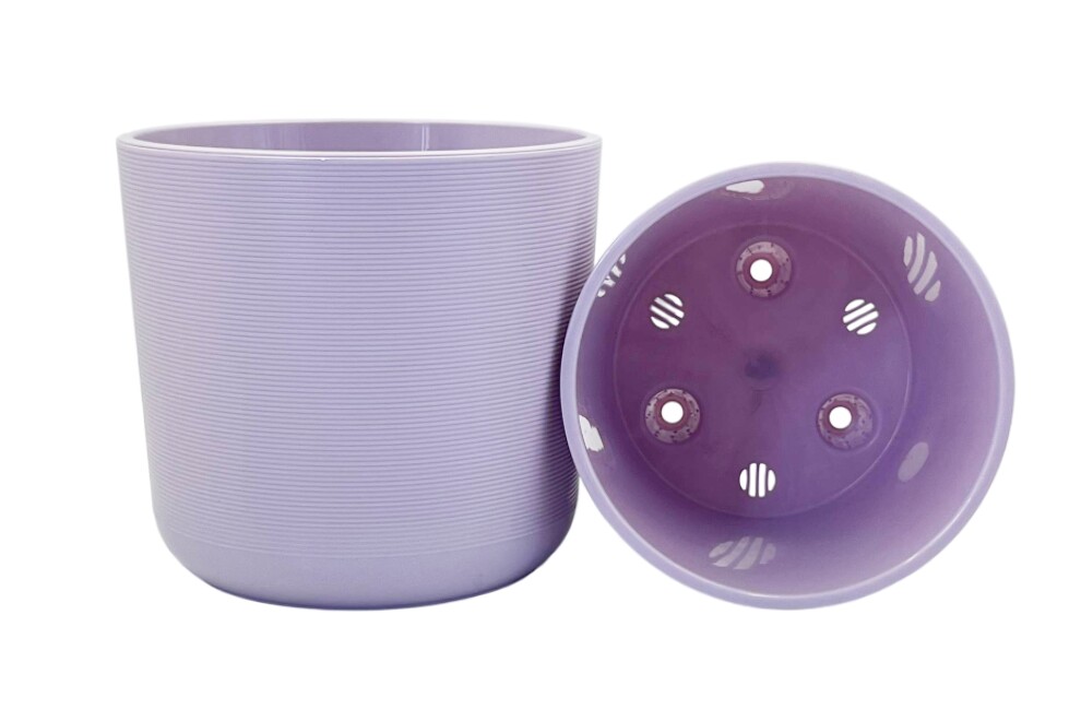 Горшок выполнен из пластика и представлен в цвете лаванда. Наличие вкладки позволяет улучшить дренаж и поддерживать оптимальные условия для роста растений. Такие горшки часто используются для домашних цветов, а также для оформления балконов и террас.