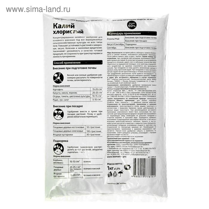 Классическое минеральное удобрение с высоким содержанием калия. Применяется для восполнения питательных веществ и нормализации развития садово-огородных растений.
