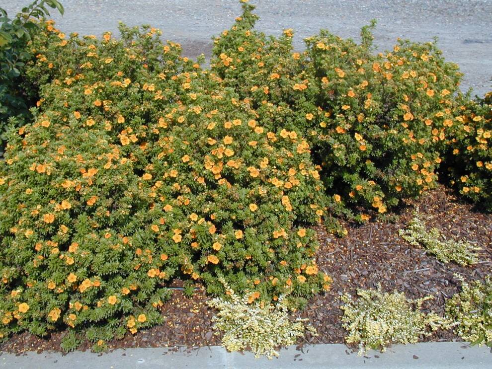 Низкорослый (до 60 см), компактный, густой кустарник с округлой кроной и яркими двуцветными цветками (оранжево-желтыми с красным оттенком к центру), обильно цветущими с июня до заморозков, на фоне светло-зеленой, серебристой листвы, неприхотлива, зимостойка и предпочитает солнце.