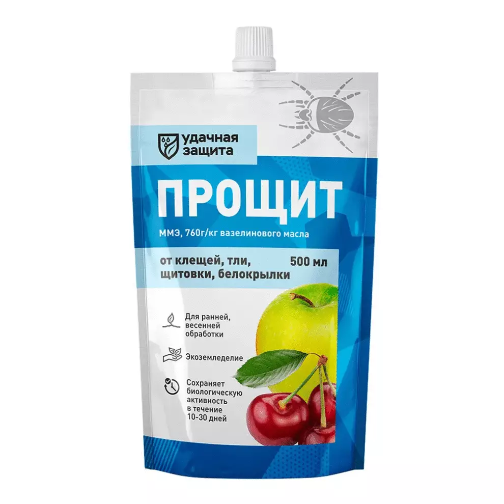 ПРОЩИТ это эффективное средство для борьбы с зимующими вредителями. Его основное действующее вещество вазелиновое масло, которое физически воздействует на вредителей, не вызывая у них устойчивости.