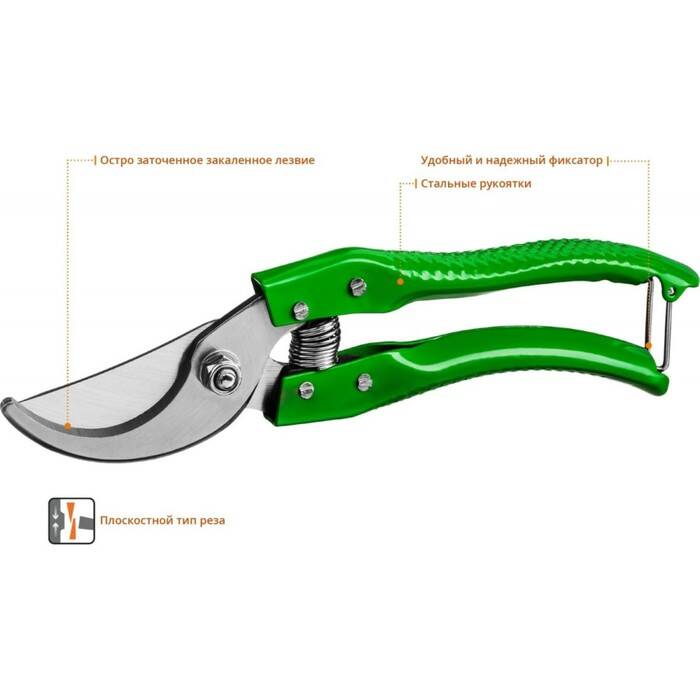 Предназначен для обрезки веток, стеблей и садовых растений. Изготовлен из углеродистой стали, что обеспечивает прочность и долговечность инструмента, лезвия имеют закалённую поверхность, сохраняют остроту и не деформируются при работе с ветками разной толщины.