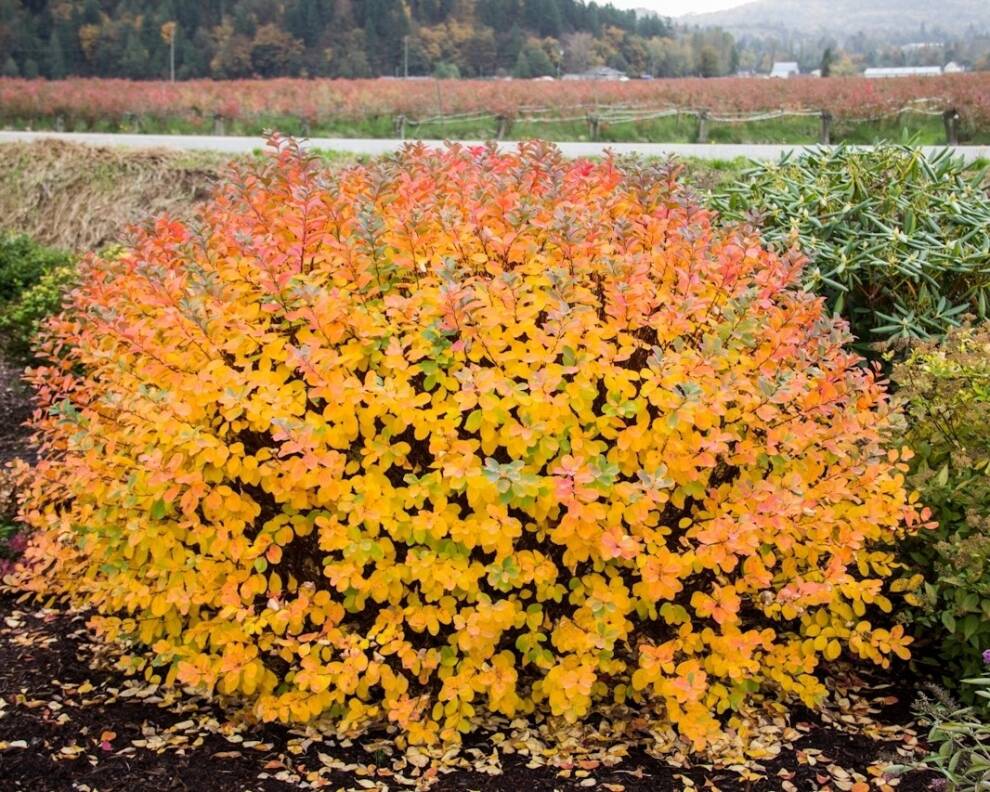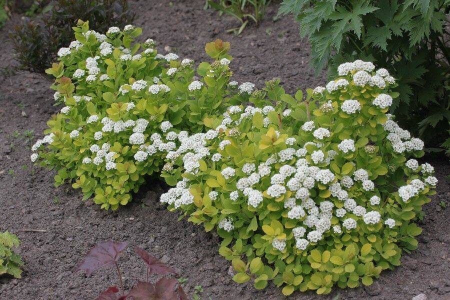 Шаровидный декоративный кустарник с красивой окраской листьев. Размер куста до 1м. Листья небольшие, жёлто-салатового цвета, осенью приобретают оттенки от жёлто-оранжевого до красно-пурпурного. Цветки пятилепестковые, белые, собраны в щитковидные соцветия. Цветение обильное в июне-июле. Растет на любых почвах, неприхотлива, влаголюбива