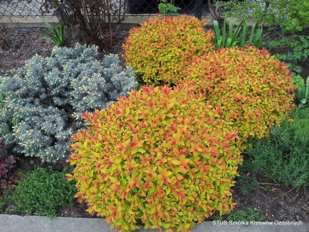 Низкорослый кустарник высотой до 0,6 м, с раскидистой кроной диаметром до 1 м и дуговидными побегами. Листья эллипсовидные оранжево-красной окраски, позднее оранжево- жёлтые и зеленовато-жёлтые во время цветения. Осенняя окраска огненно-красная. Цветки насыщенно-розовые. Похожа на ‘Goldflame’, но молодая листва почти красная.