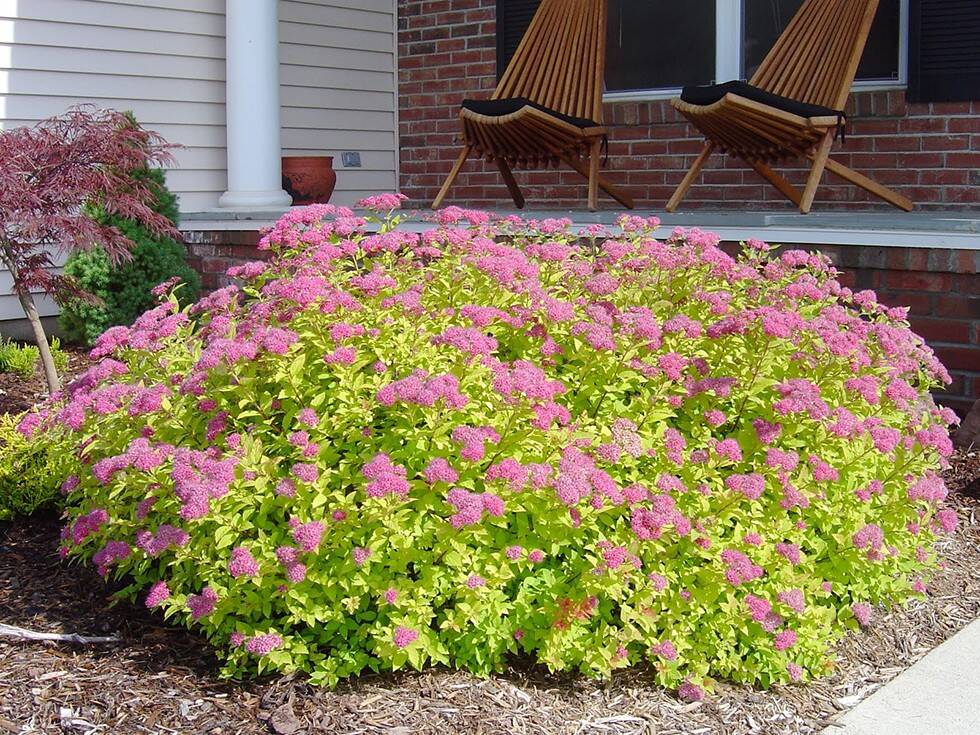 Компактный кустарник высотой до 0,5 м, с округлой кроной диаметром до 1 м. Листья ярко-жёлтые в течение всего сезона. Осенью с тёплым оранжево-жёлтым оттенком. Цветки розовые (собраны в плоские щитковидные соцветия. Цветение продолжительное, с июля по октябрь.